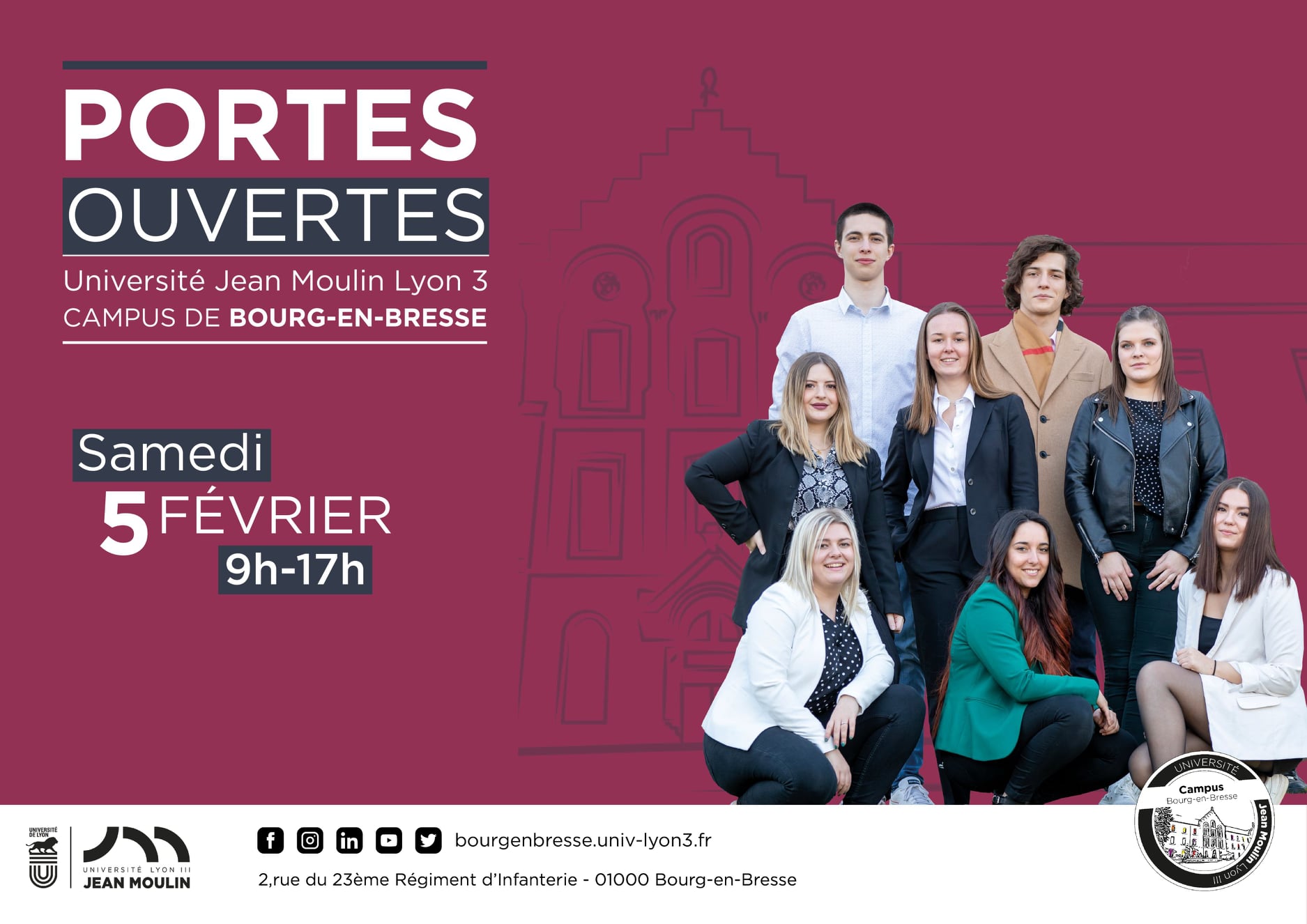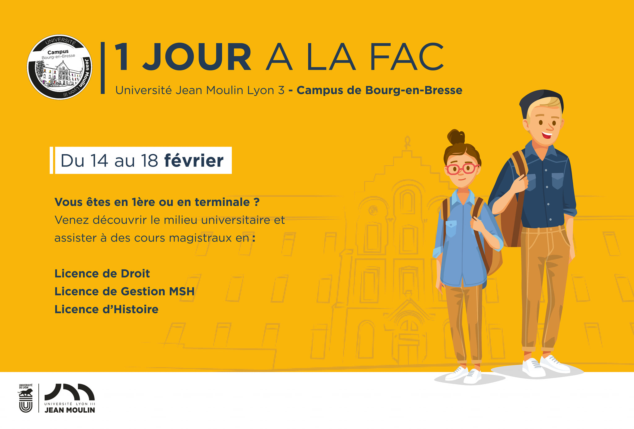 Comme chaque année, le Campus de Bourg-en-Bresse de l’Université Jean Moulin Lyon 3 organisera ses portes ouvertes le samedi 5 février.