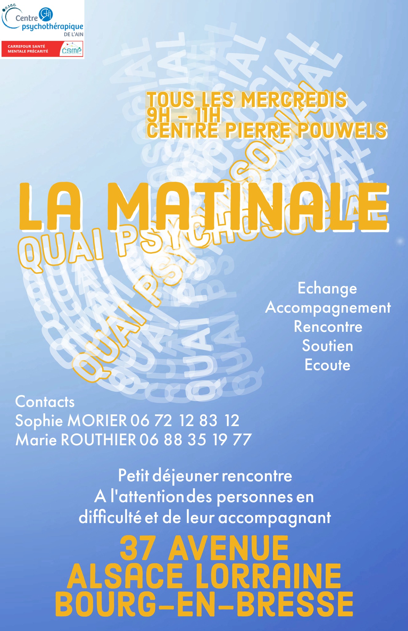 Le Carrefour Santé Mentale Précarité propose une permanence d’accueil et d’écoute au Centre de Santé Mentale Pierre Pouwels en centre-ville de Bourg-en-Bresse.