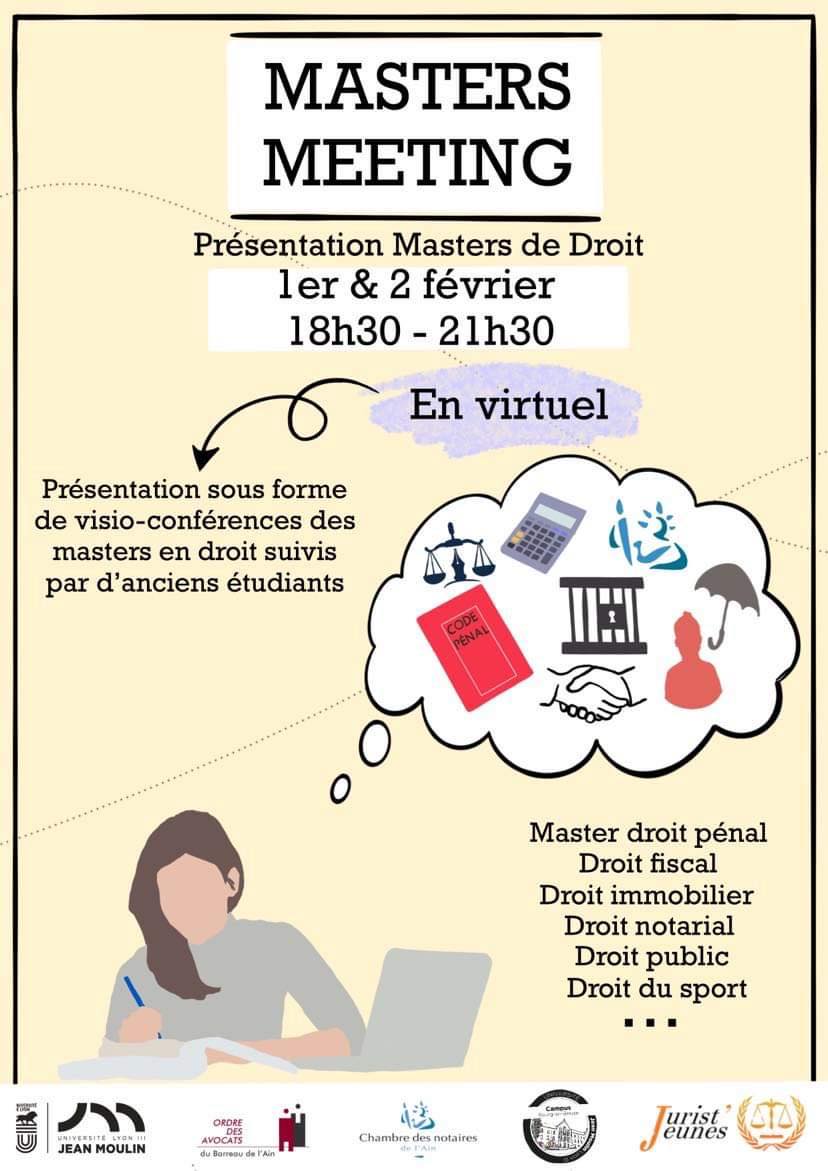 Les étudiants de l’association Jurist’Jeunes proposent un masters meeting en droit 100% virtuel mercredi 2 février à partir de 18h30. Ces conférences à destination des étudiants en licence de Droit sont une très belle opportunité pour eux de réussir au mieux leur orientation en master qui arrive à grands pas !