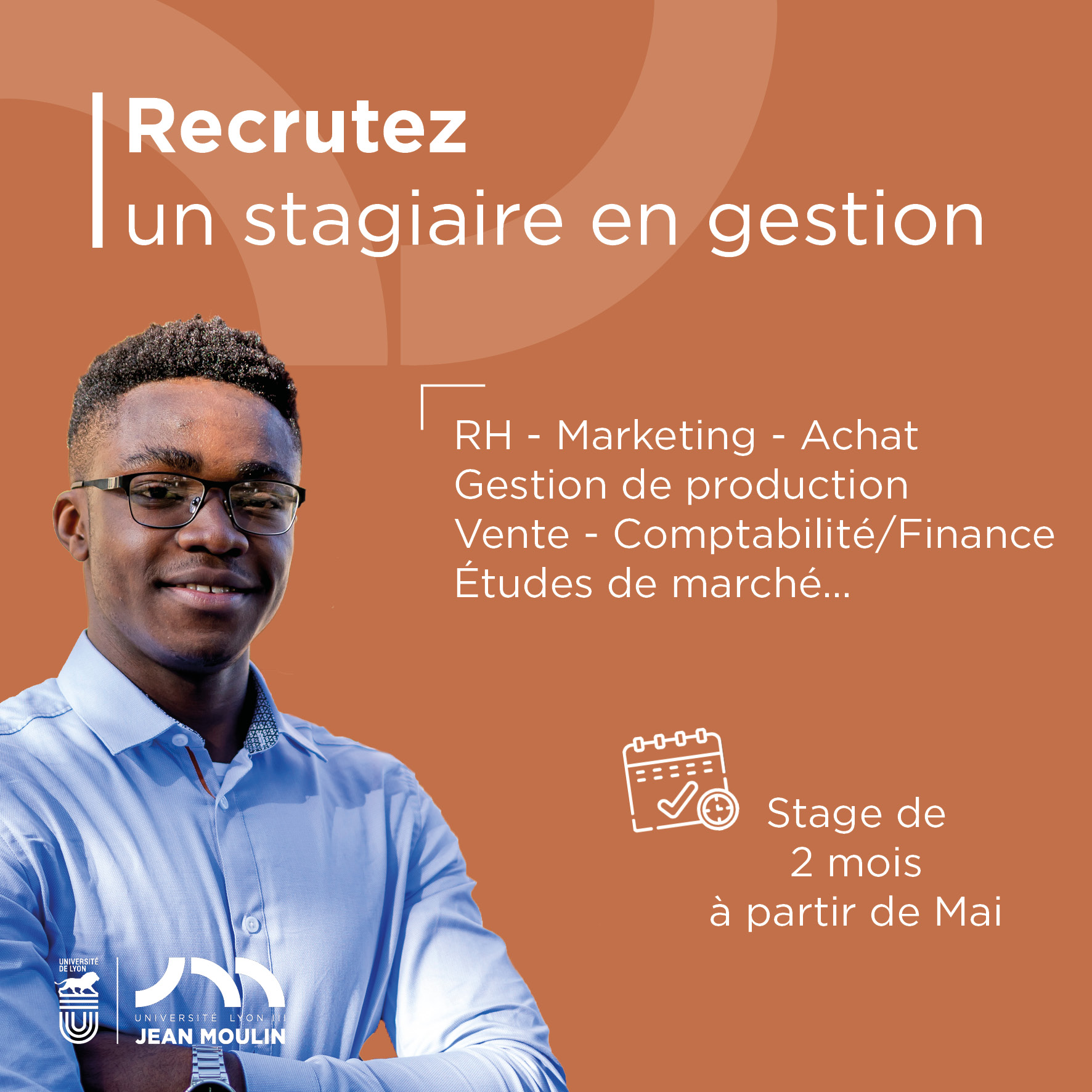 Ces étudiant(e)s ont une formation polyvalente de Gestion et Sciences Humaines et souhaitent valider leur projet pour accéder à un master tout en acquérant des compétences clés. Ils ont besoin de vous, n’hésitez pas à faire appel à eux pour vous accompagner dans vos projets ! Contactez Marine De Boni : marine.de-boni@univ-lyon3.fr ou au 07 81 33 00 67.