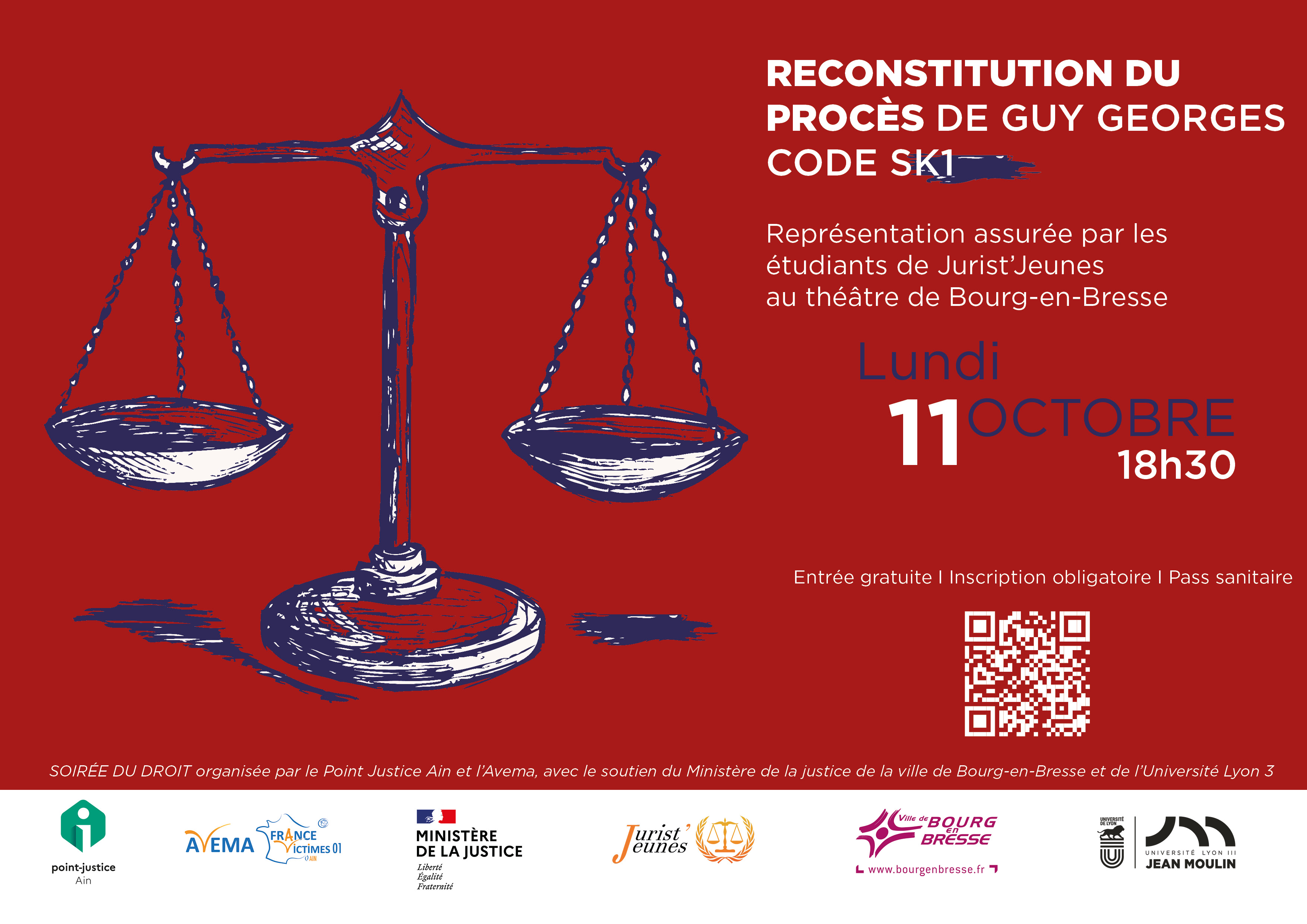 L’association étudiante Jurist’Jeunes organise en partenariat avec le Point Justice de l’Ain, l’Avema et le soutien du Ministère de la Justice de la ville de Bourg-en-Bresse et l’Université Jean Moulin Lyon 3, une reconstitution théâtrale du procès de Guy Georges, la célèbre affaire SK1.