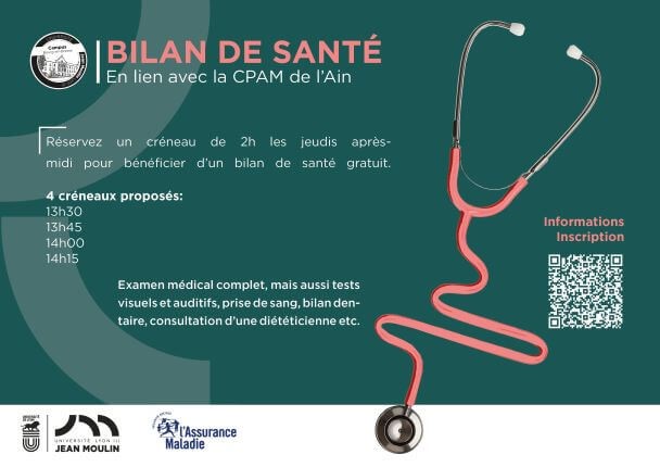 Nouveauté pour cette rentrée universitaire, le Campus propose aux étudiants et alternants un service en lien avec la CPAM de l’Ain pour réserver des créneaux , les jeudis après-midi, afin de réaliser des bilans complets de santé gratuits : tests visuels et auditifs, prises de sang, bilans dentaires, consultations d’une diététicienne, tabacologue etc…