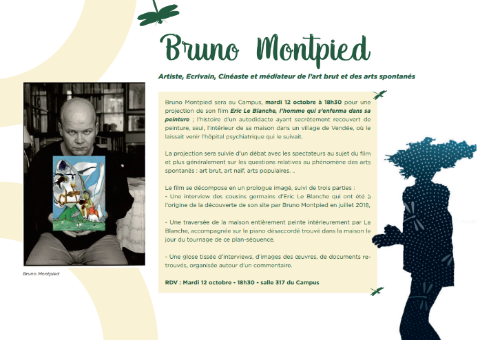 Dans le cadre de l’exposition de la BHN et des Journandises au Campus, nous accueillerons Bruno Montpied le mardi 12 octobre prochain. Artiste-écrivain-cinéaste, médiateur des arts spontanés, il proposera au public une projection de son film Eric Le Blanche, l’homme qui s’enferma dans sa peinture. L’histoire d’un autodidacte ayant secrètement recouvert de peinture, seul, l’intérieur de sa maison dans un village de Vendée, où le laissait venir l’hôpital psychiatrique qui le suivait.