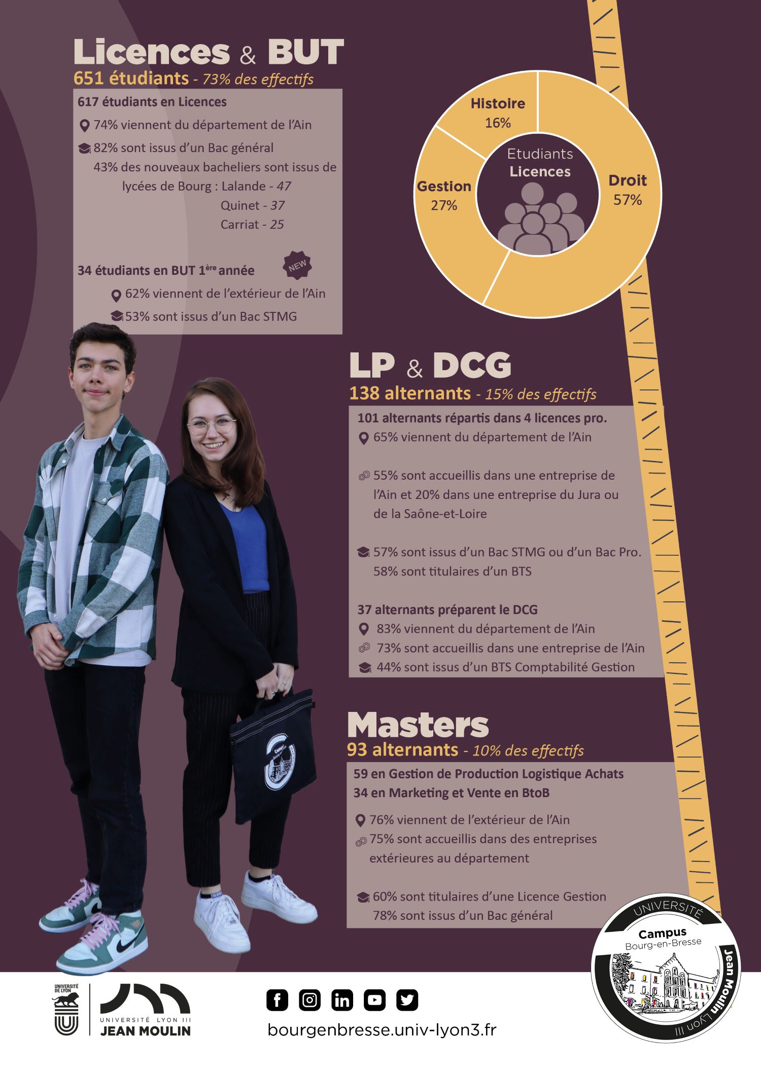 Retrouvez le détail des caractéristiques des étudiants et alternants du Campus de Bourg-en-Bresse de l'Université jean Moulin Lyon 3 sur ce lien