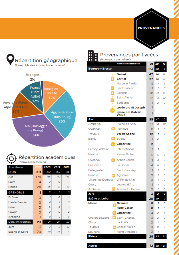 Concernant les critères géographiques, nous constatons, comme chaque année, que nos étudiants viennent à plus de 70% de Bourg et du département avec une légère évolution de l’Ain et de la région AURA (hors du département). Nous accueillons encore des étudiants de l’académie de Dijon mais les provenances de lycées se sont modifiées avec davantage d’étudiants issus de Ozanam et de René Cassin que de Lamartine.